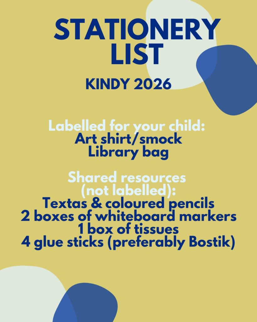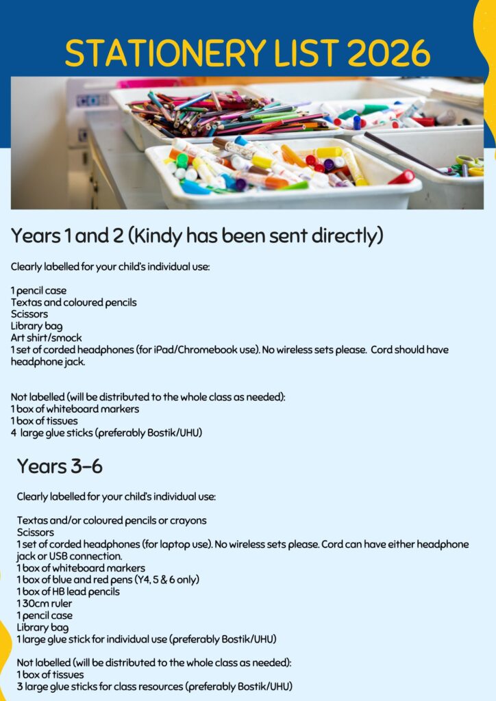 Please find the Stationery requirements for Kindy-Year 6 below. Thanks for your support!